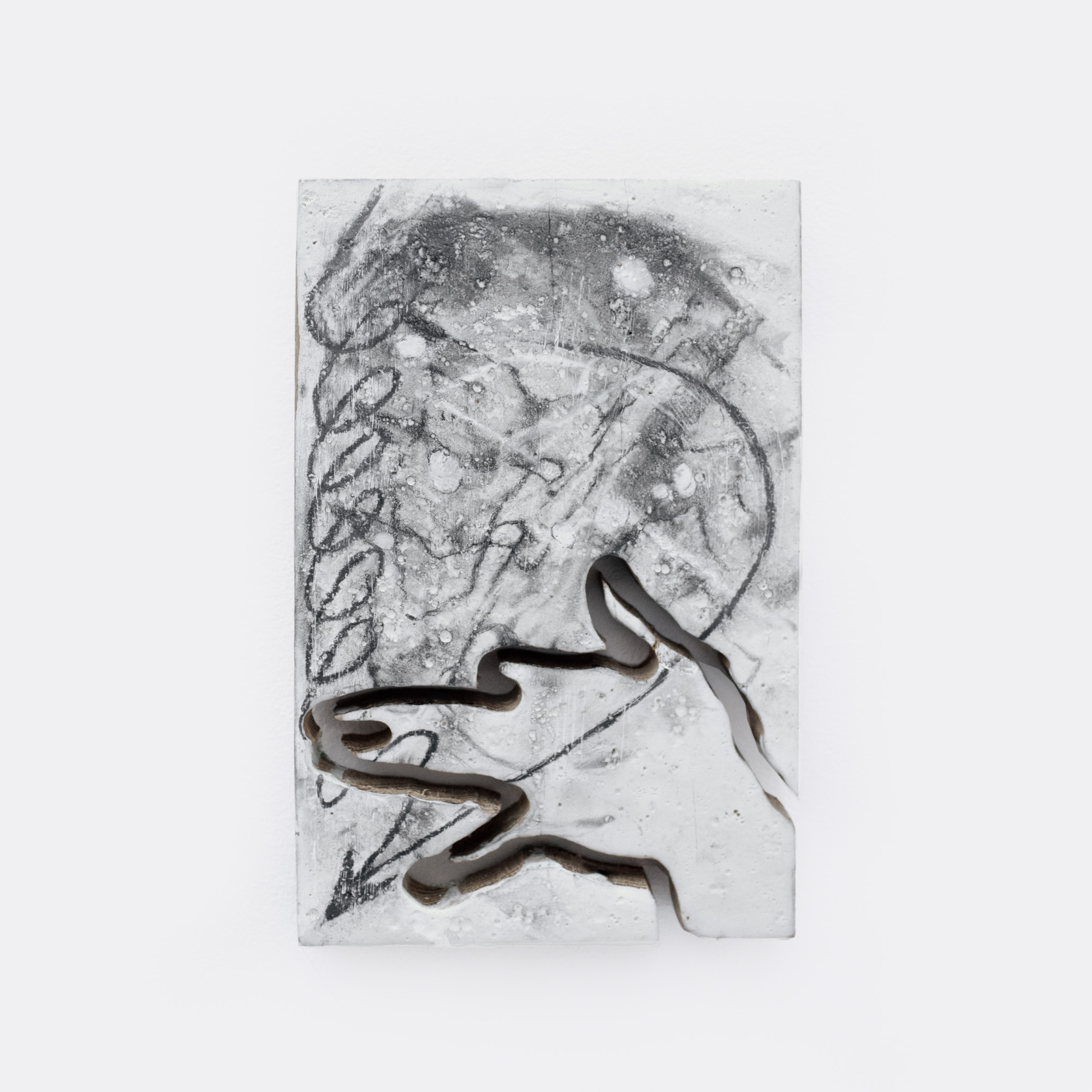 Working with graphite, carefully prepared grounds, and translucent materials such as natural PLA and wax, she explores stratification, fracture, and density, and the ways matter can hold memory. Good-luck charms, superstitions, and mythologies, both personal and collective, play an essential role in her work.